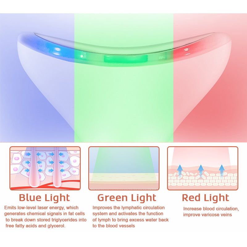 - Blue Mode: Emits low-level laser energy, which generates chemical signals in fat cells to break down stored triglycerides into free fatty acids and glycerol and release them through channels in the cell membrane.